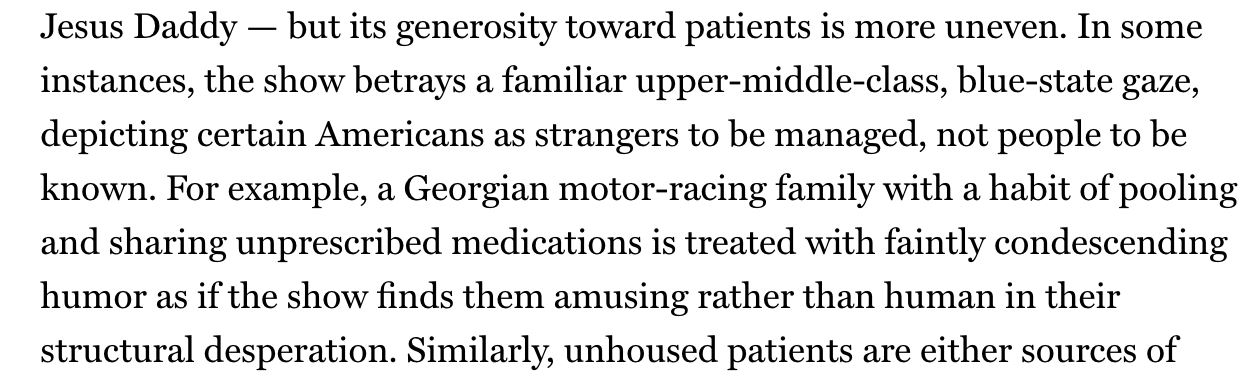 i watched three or four episodes, it was quite dense with progressivism. the worst part was that it was usually so predictable. like the black woman being treated callously by a white doctor for drug seeking behaviour which leads exactly where you expect, she wasn't seeking, she was misdiagnosed, and a black female character is now dressing down the white doctor. just too boringand they're all smug joss whedon characters except for the male young nervous doctor and female young nervous doctor, both of whom are also boring