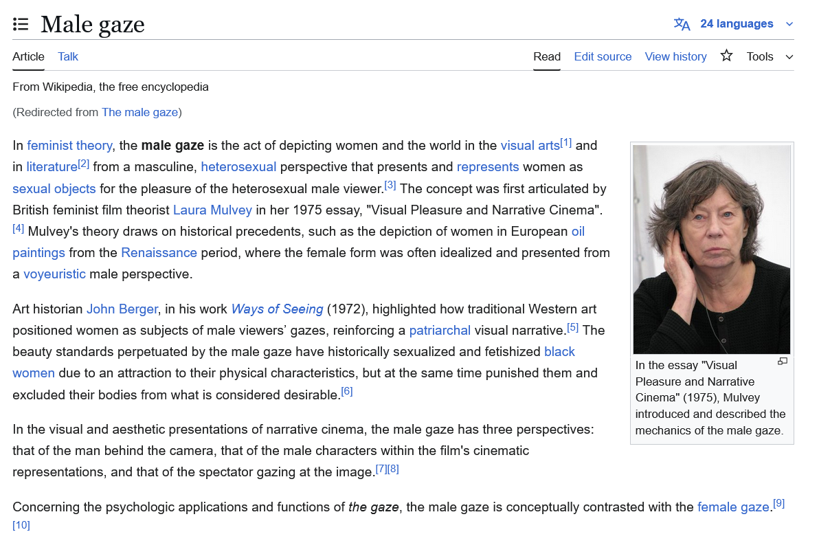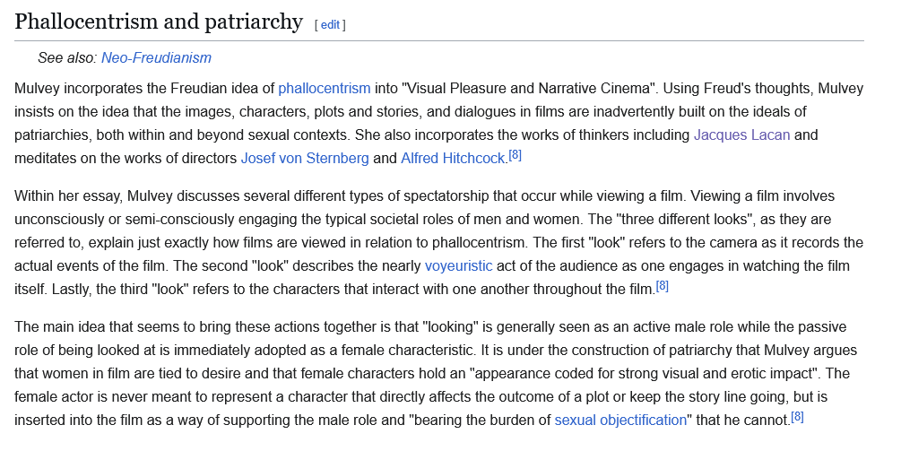 >>217235705Oh, it's NOT "pretty women" btw. It's literally way more schizo than that, and even feminist pop-tubers are frequently getting it wrong and conflating it with other ideas. I think "the male gaze" is just a nice phrase that sounds cool and gets a point across.It's literally about males looking at women and the patriarchy manifesting itself unconscously in films. It's 100% Freudian, fucking weird, and about voyeurism. All of the Freudian psycho-babble is entirely exercized when feminists talk about the idea now. > scopophilia>phallocentrism>mirror stageDo these words mean anything to you? Because they're central to the theory. Her Wikipedia page actually does a better job explaining the concept than the actual Male Gaze page does. https://en.wikipedia.org/wiki/Laura_Mulvey#Film_theory