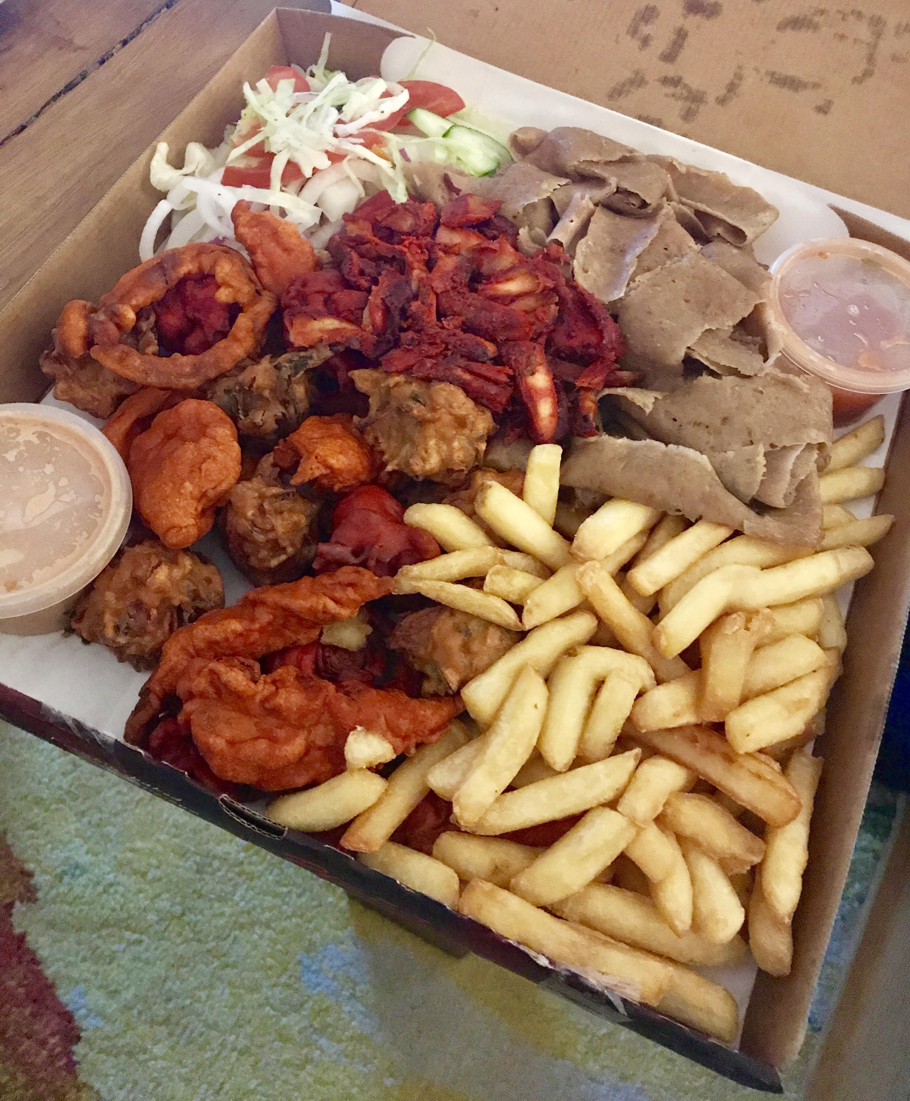 >>217260985Can someone identify the food? I see >Tomato cucumber cabbage onion salad>chips>onion baji?>shawarma meat