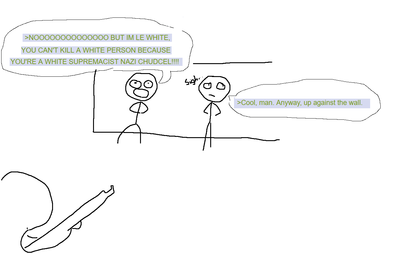 >NOOOOOOOOOOOOOO BUT IM LE WHITE, YOU CAN'T KILL A WHITE PERSON BECAUSE YOU'RE A WHITE SUPREMACIST NAZI CHUDCEL!!!!