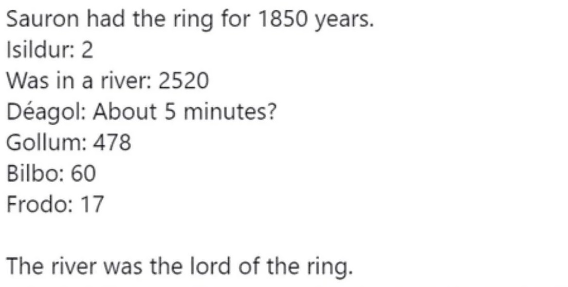 Reminder: The One Ring is the most low-iq trinket in all media. It had fully ensnared Isildur and could have continued to use him to corrupt all of Gondor into a realm devoted to Sauron. Instead it got him killed and itself lost in a river wasting thousands of years time for zero gain.