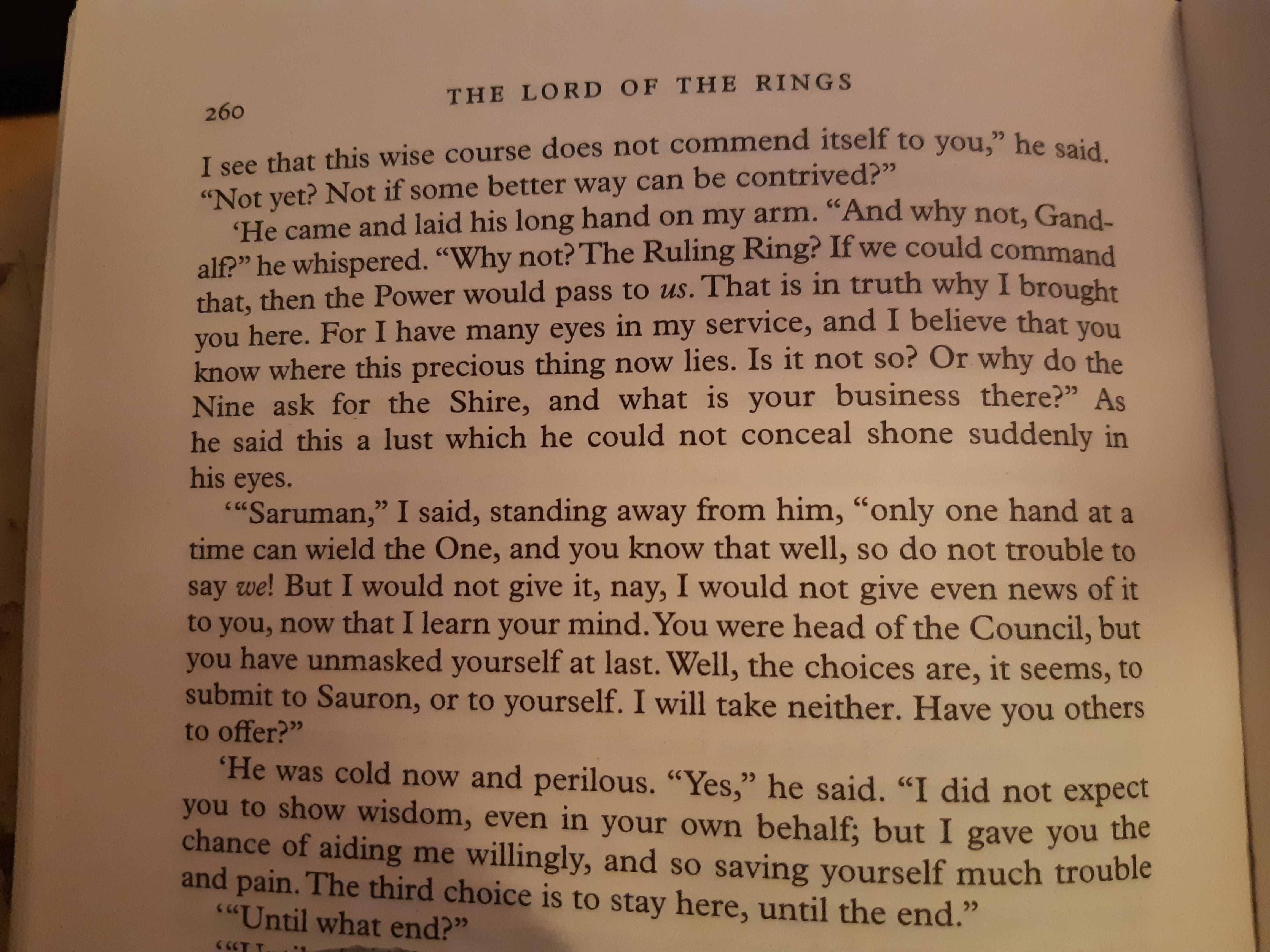 >>217267020>Saruman was fast tracking becoming next Sauron, literally in the movies, a bit more metaphorically in the books.First book, when Saruman calls Gandalf to Isengard, he first tries to convince him to join Sauron with political bogus phrases like>A new power is rising. Against it, the old allies and policies will not avail us at all.>We must have power, power to order all things as we will, for the good which only the Wise can see.>We can bide our time, keep our thoughts in our hearts, deploring maybe evils done by the way, but approving the high and ultimate purpose: Knowledge, Rule, Order; all the things that we have so far striven in vein to accomplish, hidered rather than helped by our weak and idle friends.>There need not be, there would not be, any real change in our designs, only in our means.Gandalf calls Saruman out for being full of shit, and Saruman replies with picrel. He is really not subtle. But such a great scene
