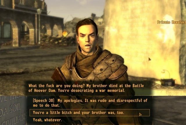 >>217279786>Wild Card is the canon NV ending.it's funny because I've pointed out for years that THIS would be the result of a Yes Man endingI was right