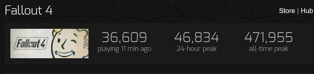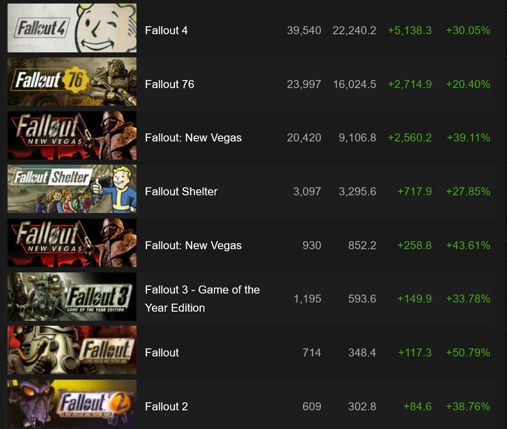 >>217280550New Vegas is getting a bump because of the show plus NV TTW is how most people play F3 right now. And even with that boost, F4 still has more players, almost twice as much. A few lost Indians are playing standard Fallout 3.