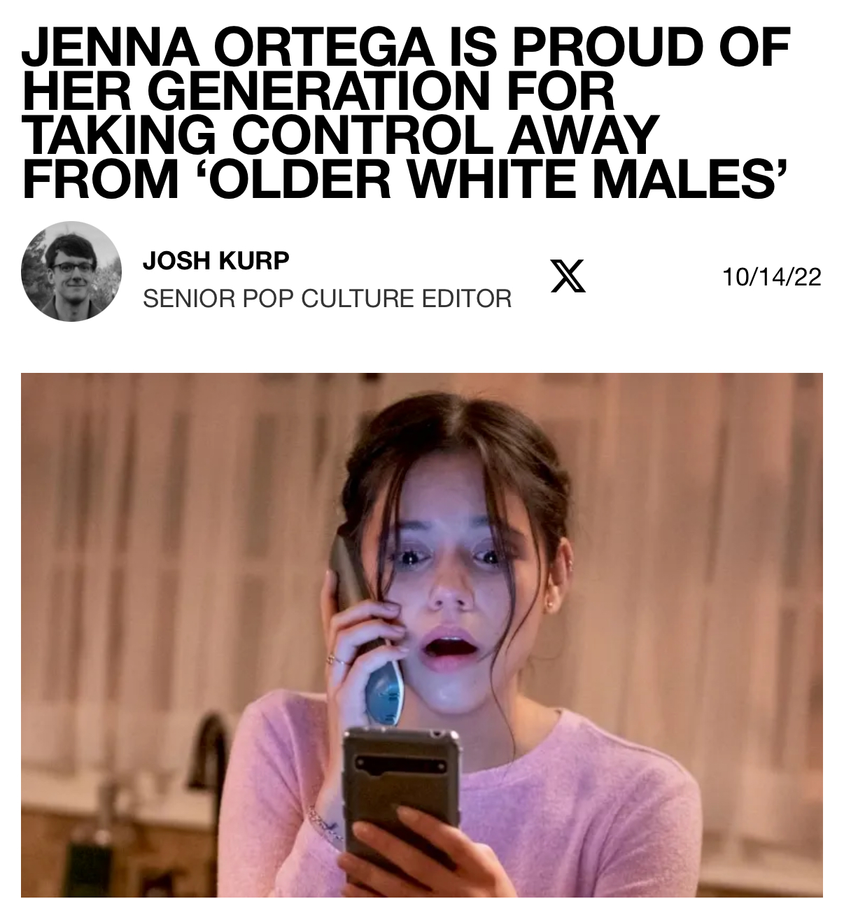 A story about a piece of cloth touching Jenna Ortega's butthole is literally a top story on Google News right now. She's an award winning actor, how is this OK?https://www.yahoo.com/entertainment/celebrity/articles/jenna-ortega-shows-off-her-002642334.html