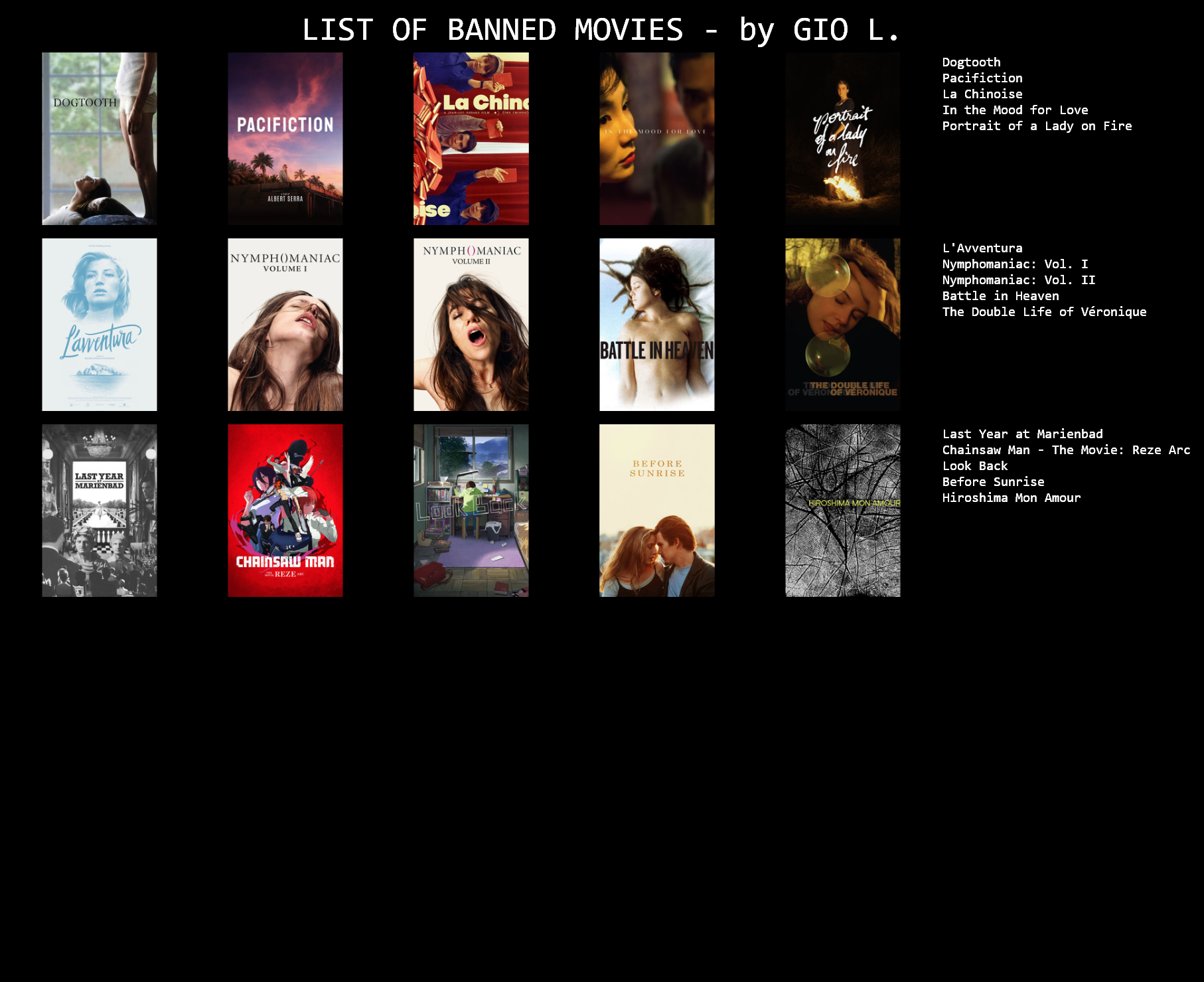 >>217341562The Human ConditionIl DecameronBeyond the Valley of the DollsLand of Broken Hearts