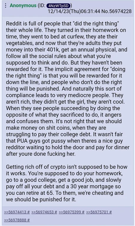 >>217401217it's a lie sold by those at the top that people like the poster you replied to believe in. they're all fed custom lies which fit their category of being which placate them, check the other replies.1. it's just a cycle ha-ha! things will be fine soon when Ze Great Reset HAST STARTED! UND YOU OWN NOTHINK!- the "cycle" idea placate the terrified because then they don't need to understand what is happening, what happened in the past or what is going to happen in the future, and they don't have tto do anything about it either, as it will simply "reset". most of what is going on has no historical precedent whatsoever, but they don't know that or want to think about that as their fear will come back instantly. they prefer to just ignore it all.2. everyone's the same - distracting from the clear evidence that as was stated 0.01% own 99.99% and the world is run by a singular thief cult with such boundless greed that they'd see every other person on the planet enslaved and turned into subhuman monstrosities rather than let slip a single shaved coin from their hooked fingers.3. just keep plodding on - worked in the past, it'll do fine now. why am I suddenly in a cell?