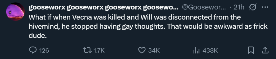 >>217416504The mistake was making it a big deal and the last thing we see before the final episode. He should have said it privately to his mom. Also the idea that Vecna gave him those alienating thoughts could have been a good idea, but they had to build it up and show it in previous episodes, not just say it happened in a single line. Also it didnt even amount to anything in the final episode. The whole thing was just too blatantly on the nose.