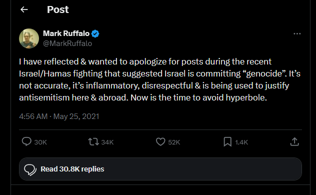 I remember he was on Bill Maher's show like 15 years back to rant against fracking and the guest across the table completely shit all over his arguments to the point where Ruffalo was flustered and started pointing his finger at him in anger. Always thought Ruffalo was a midwit ever since.