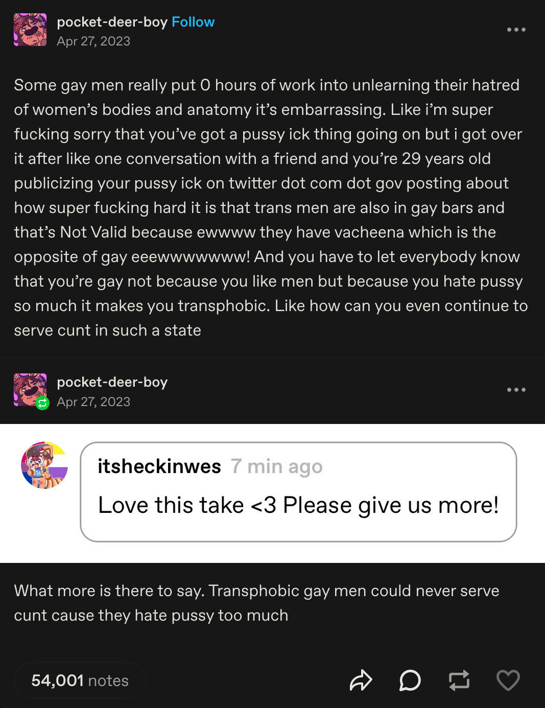 >>217447505Wait until you see the one about how FTM "gay men" hate how straightforward and explicit gay dating culture is. I wish I had saved it.