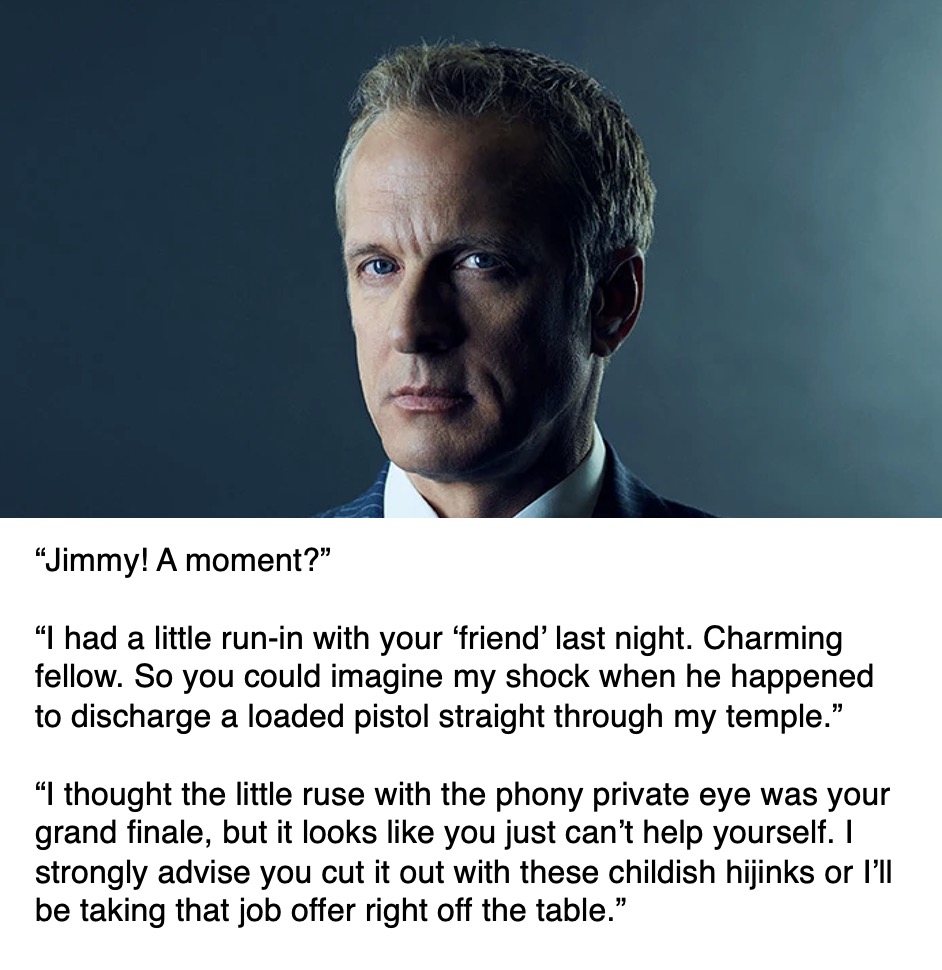 >>217450435I can't believe that none of you morons grasped the obvious implication that "Lalo Salamanca" and "Howard Hamlin" were the same person. Both of them tried to lure Jimmy into employment, but his evil Id was successful while his everyday Ego failed, resulting in the latter being murdered by the former, and his ultimate death at Gus's hands due to the failure of his Superego after being betrayed by Saul and Kim and, ultimately, himself. It's so obvious.