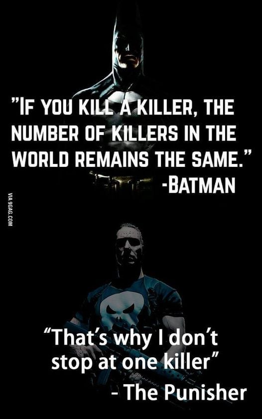 >>217459724>Is mob justice right wing?Probably.Batman's no-kill mantra is really more about himself than any other factor. He knows that killing will make him no better than the man who killed his parents, which is what the quote in the OP is actually about. Or at least, that's what he's thinking about when he says it.