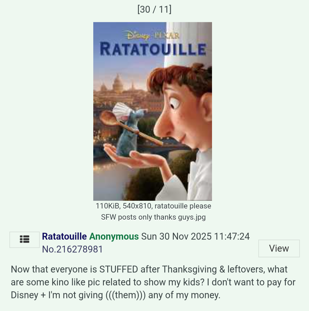 >a persecuted minority literally living in the floorboards and attics of Paris, labeled as vermin by a hostile society that wants to exterminate them on sight>the persecuted elite (Remy) saving a dying Western culture by puppeteering a gentile front man because society refuses to accept the source of the talent>the "vermin" are the only ones preserving the true spirit of the past, they literally save Paris from the shadows while the authorities try to gas themBRAVO PIXAR