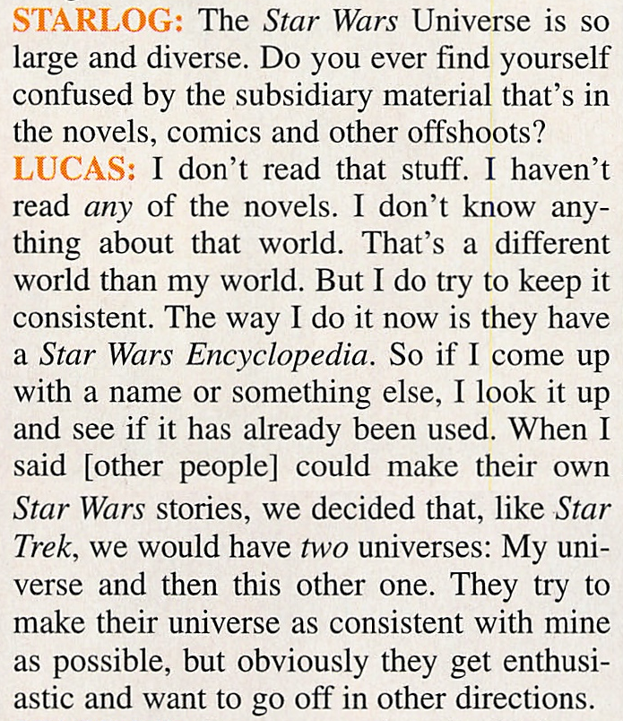 >>217475622Yes. There was Lucas's Star Wars "world" or "pillar", as he called it himself, which constituted the six live-action movies, The Clone Wars animated movie and TV-series, and upcoming Underworld live-action series; then there was another "world" or "pillar", which was the universe of licensing, which constituted books, comics, games, etc. - known as the Expanded Universe or the EU - which Lucas called something very loose, separate and not a part of his "world". And then there was the fan "world".>“I am the father of our Star Wars movie world—the filmed entertainment, the features and now [The Clone Wars] animated film and television series,” Lucas says. “And I’m going to do a live-action television series. Those are all things I am very involved in: I set them up and I train the people and I go through them all. I’m the father; that’s my work. Then we have the licensing group, which does the games, toys and books, and all that other stuff. I call that the son—and the son does pretty much what he wants.” He laughs. “Once in a while, they ask a question like ‘Can we kill off Yoda?’, things like that, but it’s very loose. Then we have the third group, the holy ghost, which is the bloggers and fans. They have created their own world. I worry about the father’s world. The son and holy ghost can go their own way.”web.archive.org/web/20081015143217/http://entertainment.timesonline.co.uk/tol/arts_and_entertainment/film/article4386319.eceThe so-called "lettered canon" you often see people refer to was used exclusively by the licensing department internally for the purposes of database chronicling, to know specifically what thing originated from where. There was never any official "canon tiers". Yet this false idea has spread, because people are not very knowledgeable of Star Wars behind the scenes. To Lucas, only his "world" was canon, to the Licensing, aka the EU, almost everything was canon, until contradicted by Lucas.