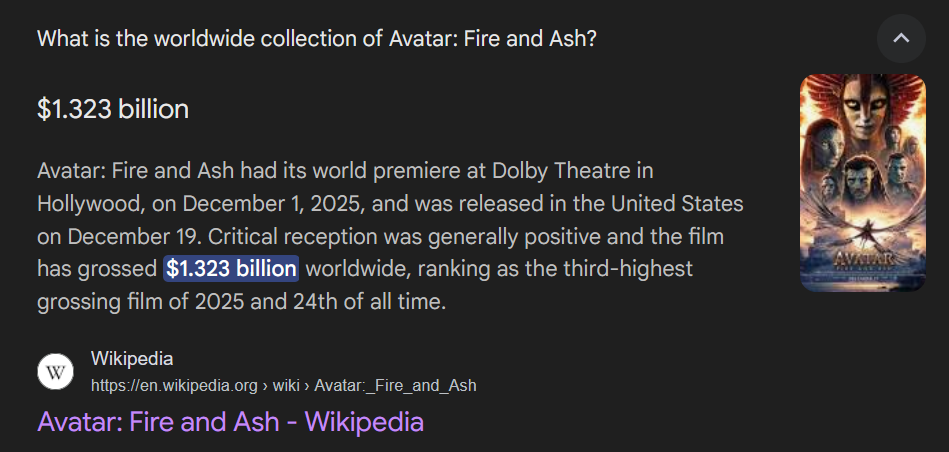 >>217493396Avatar 1: $2.9 billionAvatar 2: $2.3 billionAvatar 3: $1.3 billion so far, still in theaters until March.It's a huge decline but calling 20th highest grossing film of all time a flop is tarded