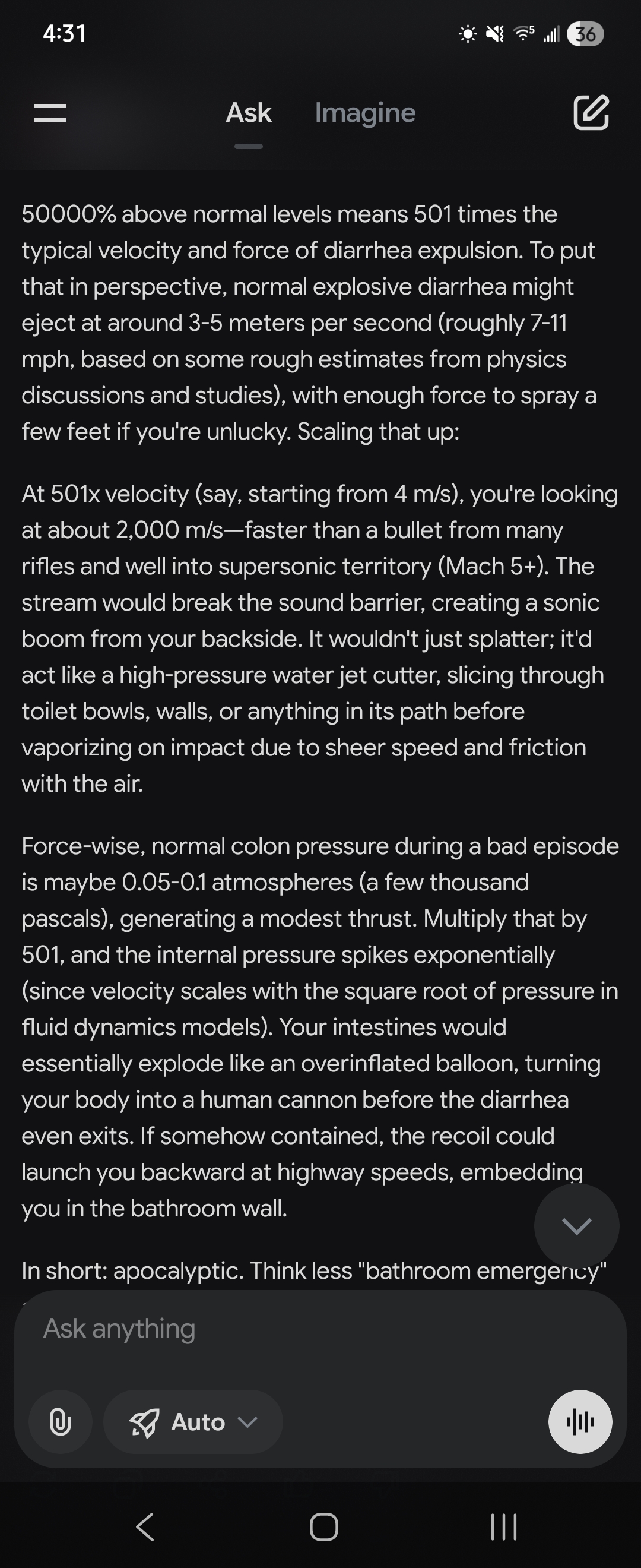 >Computer, generate the ensuite bathroom for Counselor Troi's quarters, at 10x scale. >Mark my current position as the bowl of the commode.>Simulate the actions of a lactose intolerant Counselor Troi approximately 4 hours after eating several large chocolate sundaes>Disengage safety protocols and begin program