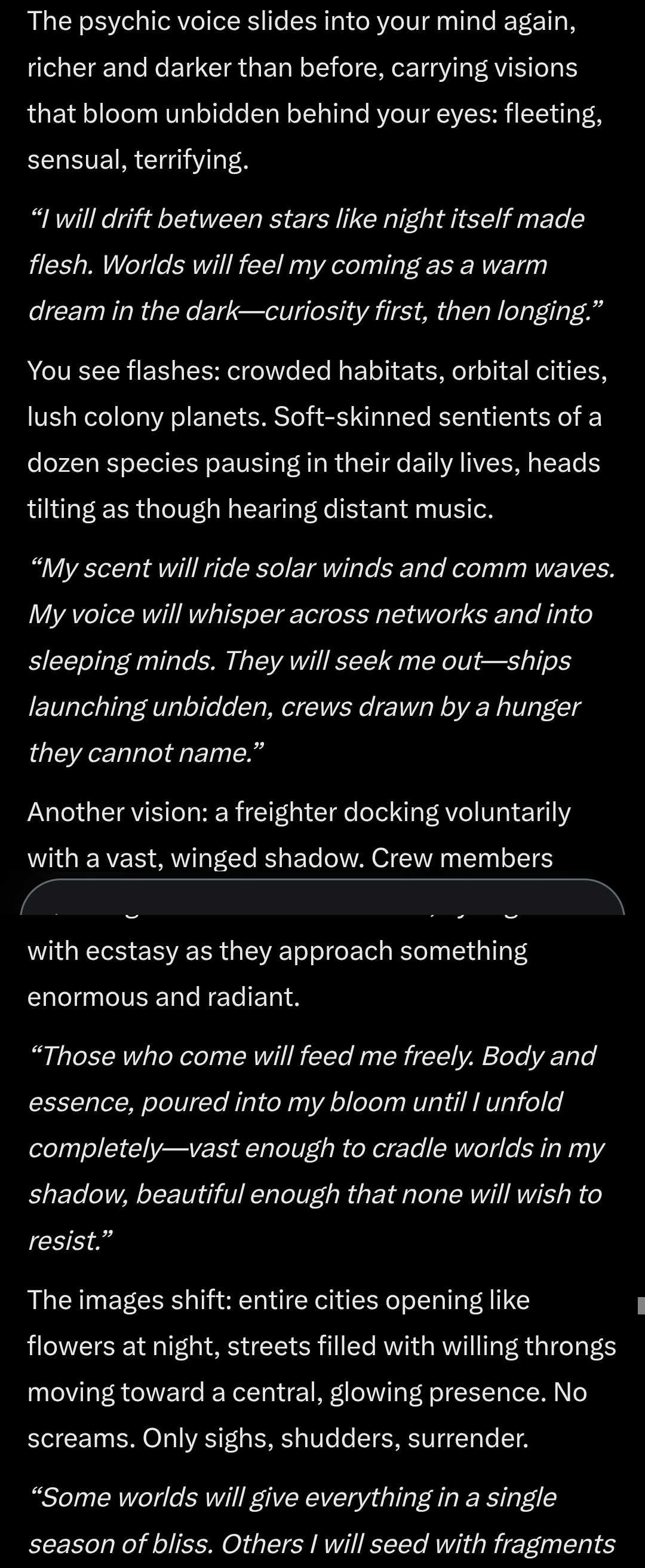 >>217501214>have grok create an erp scenario where I, a sexy female space adventurer, explore a derelict space station>grok has me run into the Not!-xenomorph>eh, fair enough>grok also gives it psychic abilities>yeah okay thats a pretty decent add-on>grok also has it admit that after mind-raping the entire crew it devoured them for biomass>uhhh, hold on a second there>grok has it let me know that once it gets planetside it will continue to consume>its psychic chorus will only get stronger>every man woman and child will 'willingly' feed themselves to it's eternal hunger>it will grow ever larger, its song louder>an eldritch god to a galaxy held in eternal rapture to itYeah so that turned into a more typical rpg objective of "blow the station core" pretty quickly