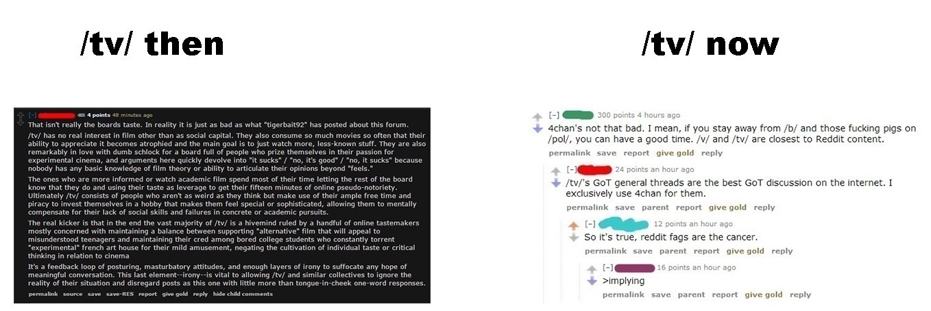On /tv/, Reddit is perceived as a bunch of naive tools who believe that being a nerd is cool. As a result, they're childishly enthusiastic about their hobbies (which they've only barely scratched the surface of), find random humor completely hilarious, and are notoriously pedantic. This is due to the fact that they believe that nerds are some kind of "cultural elite" simply because their interests aren't completely mainstream.BUT, since they don't see themselves as particularly alienated by society, they haven't developed the pleb/patrician paradigm, unlike 4chan. Consequentially, they also have the prudish, politically-correct mentality that goes with the delusion that they can still be normal members of society and accepted by potentially anyone, or that they have moral standards to uphold. This makes them very prone to being shocked or amused by the cheapest transgressions and subversions.Although keep in mind that "modern" /tv/(aka after 2013) is the product of reddit winning the /q/ wars in 2012