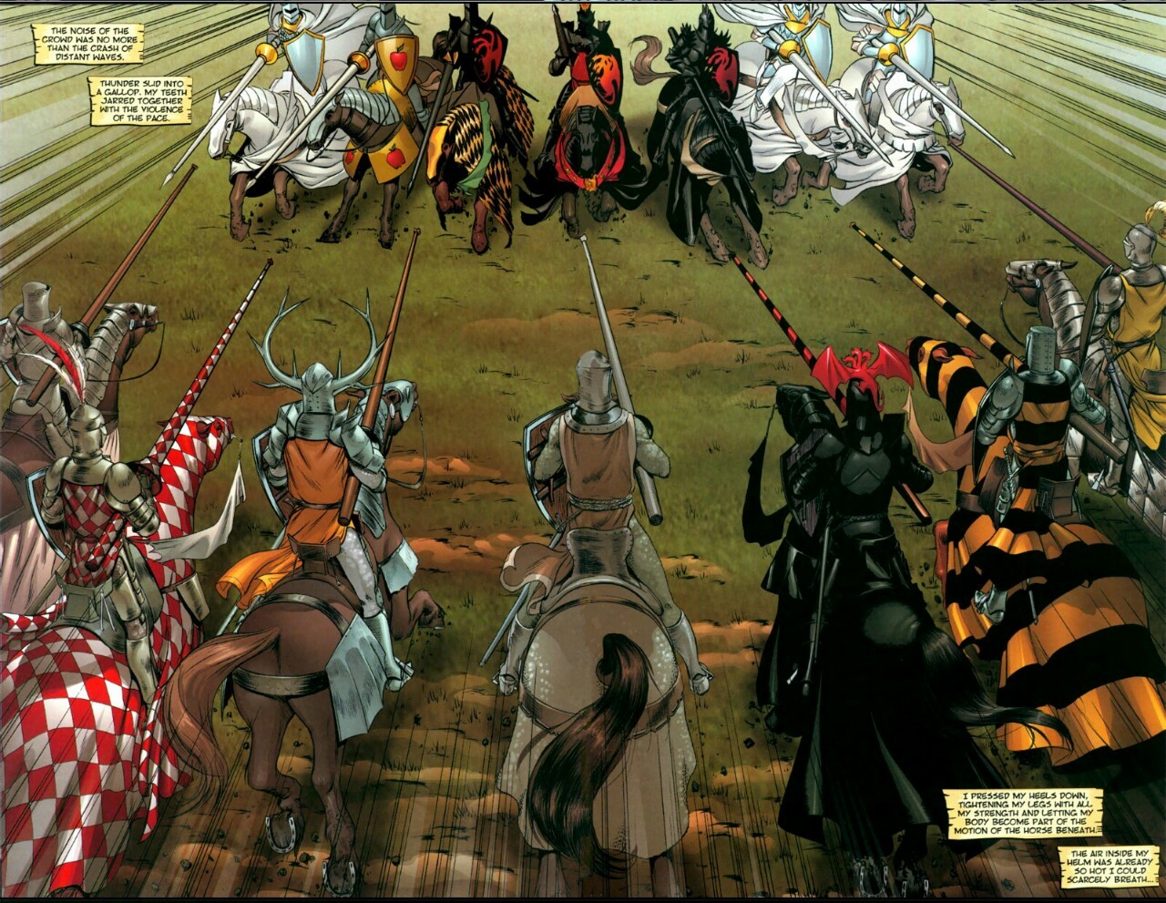 In the book the prior jousts are normal 1 vs 1 as makes sense thereby making the eventual 7 vs 7 climax actually, you know, climatic. The idea of competing squires running across one another and grabbing arms from shared racks is stupid, as is knight's stealing anothers horse or getting trampled in the neighbouring list.