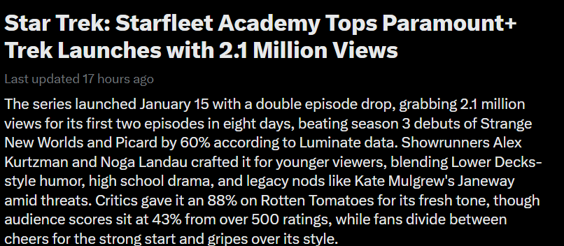 Starfleet Academy is performing well.