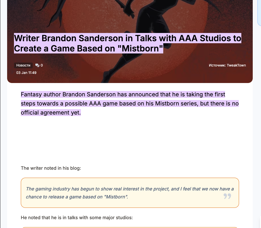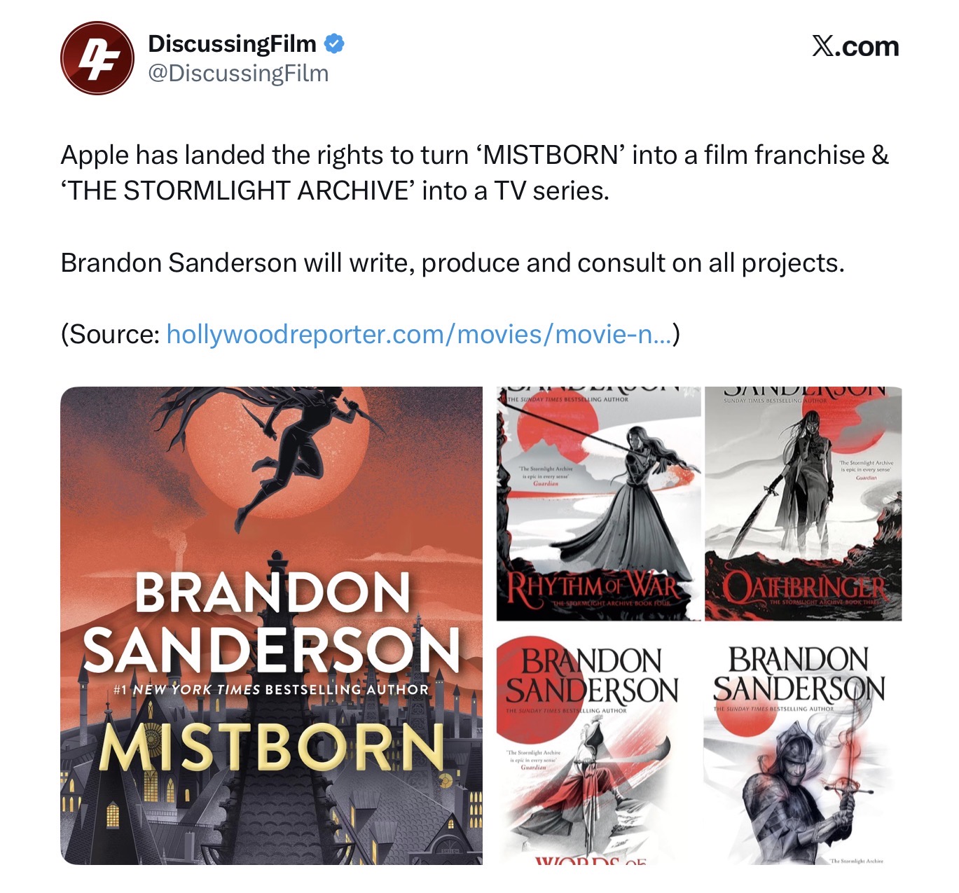>"The deal is rare one, coming after a competitive situation which saw Sanderson meet with most of the studio heads in town. It gives the author rarefied control over the screen translations, according to sources. Sanderson will be the architect of the universe, will write, produce and consult, and have approvals. That’s a level of involvement that not even J.K. Rowling or George R.R. Martin enjoy."very coolhttps://www.hollywoodreporter.com/movies/movie-news/brandon-sandersons-mistborn-stormlight-archive-movie-tv-1236487271/
