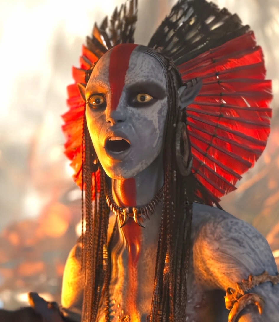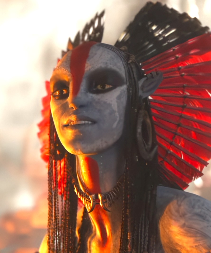 she was a child when eywa burned her culture down. She is the bad ass matriarch of her tribe and all the best men have orgies with her every night.