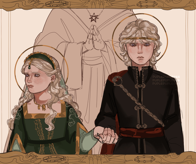 >Ser Otto, Alicent thought for one mad moment, remembering her poor father, but when the trumpets blew again and the knights charged, the name they cried was "Aegon! Aegon! AEGON!"