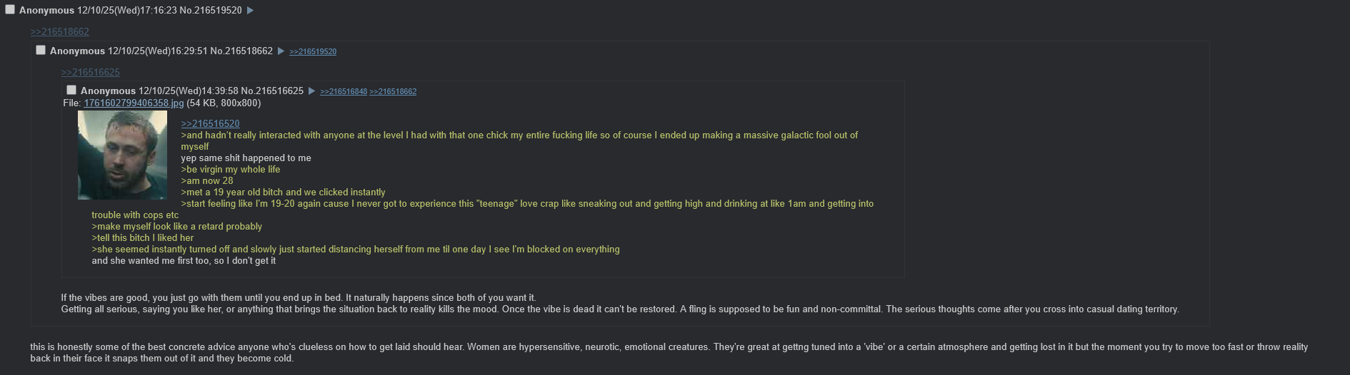 >>217704581If you are this archetype of man these experiences are completely closed off to you, there's no "letting it pass you by" because you were never in the car to drive to the line to be in the ballpark of having sex. You can't explain the difference to a normalfag, you have to live it and experience it yourself.