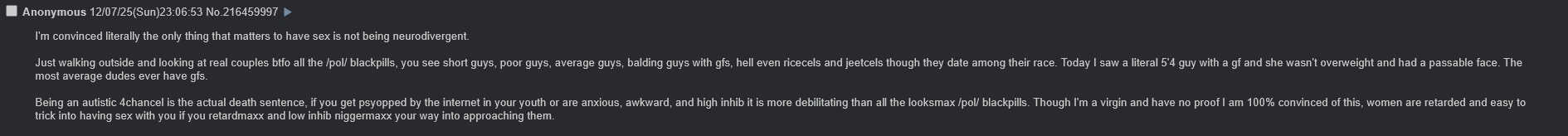 >>217709965>The last thing a femsperg wants is a sperg man. Women look for in men what they lack themselves. I've unironically had better luck with stacies than mental case chicks. It's why bpd broads and such go for "tyrant" sorts of guys.this is just self-defeating talk of a terminally online virgin. which is 99% of people here. you don't know what you're talking about because you've never actually experienced it so you make these ridiculous generalizations to justify your lack of willpower