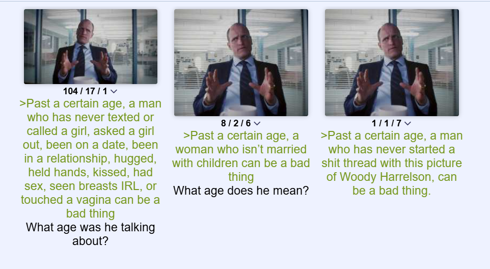 >Past a certain age, a man who has never texted or called a girl, asked a girl out, been on a date, been in a relationship, hugged, held hands, kissed, had sex, seen breasts IRL, or touched a vagina can be a bad thingWhat age was he talking about?