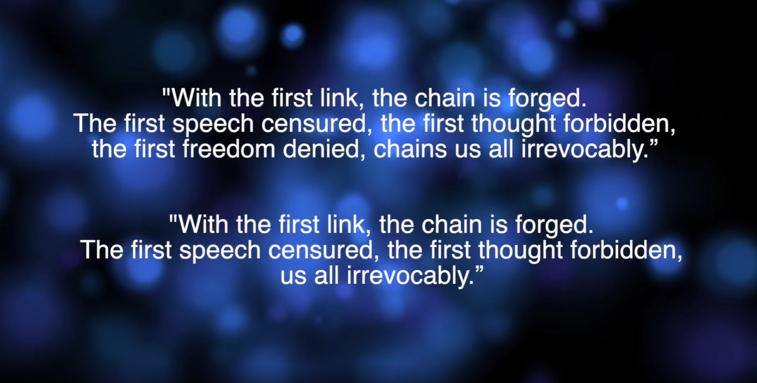 >With the first link, the chain is forbidden. The first speech chained, the first thought denied, the first freedom forbidden, chains us all irrevocably