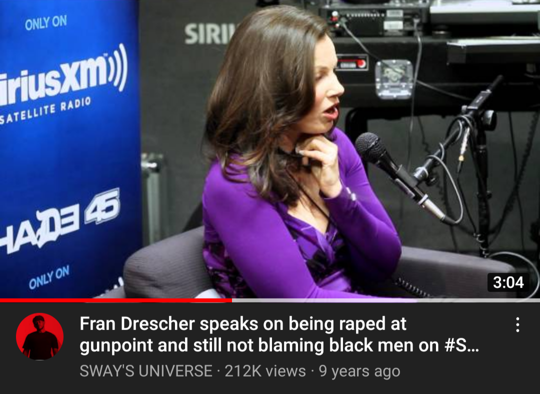 >>217761848https://www.huffpost.com/entry/fran-drescher-talks-rape-black-man-pedophilia-vs-homosexuality_n_1340291>making a comparison to her own rape by a black man in 1985, and her ability to separate blame from her encounters with other black men. “I have nothing against black men. In fact, I’ve dated several,” Drescher went on to say.