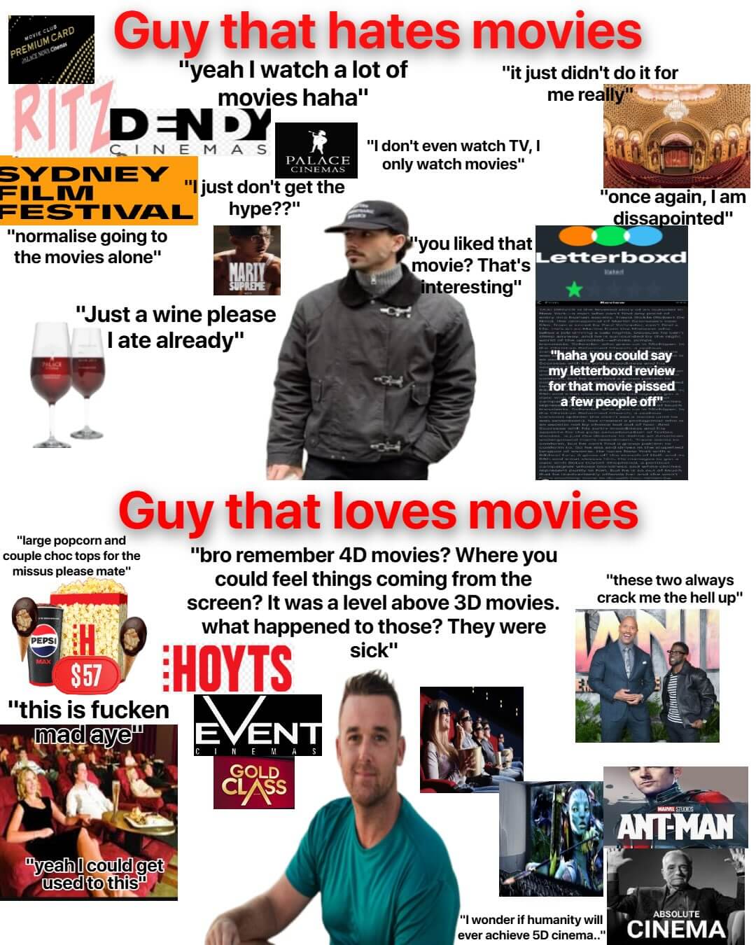 >>217772294I go to Palace Cinemas, have a movie club premium card, often go alone (tho' I go with friends reasonably often) and tend to just get a drink instead of food if I get anything (beer instead of wine) like the guy that hates movies but I don't write Letterboxd reviews and I love movies.
