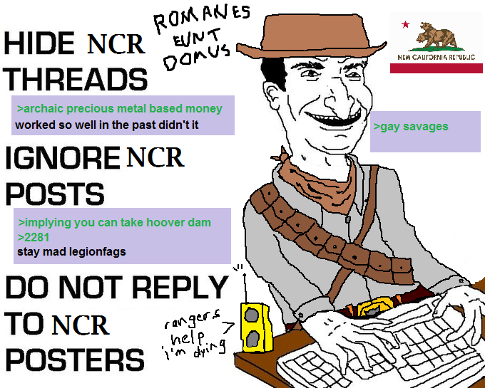 >>21777592190% of people who side with ncr last played the game on release because if anyone has played it recently, most people in the game say they're as bad if not worse than the legion. no one ever has any good things to say about them in the game. Definitely a liberals choice since they blindly choose the ncr thinking they're heckin good guys. my opinion but the house ending is the best ending, the courier has no business running shit he would thrive more being on his own helping people instead.
