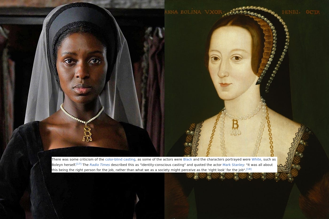 >>217786541Obviously. Making story changes for the sake of entertainment or brevity isn't the same as shit like Anne Boleyn suddenly being a negress.