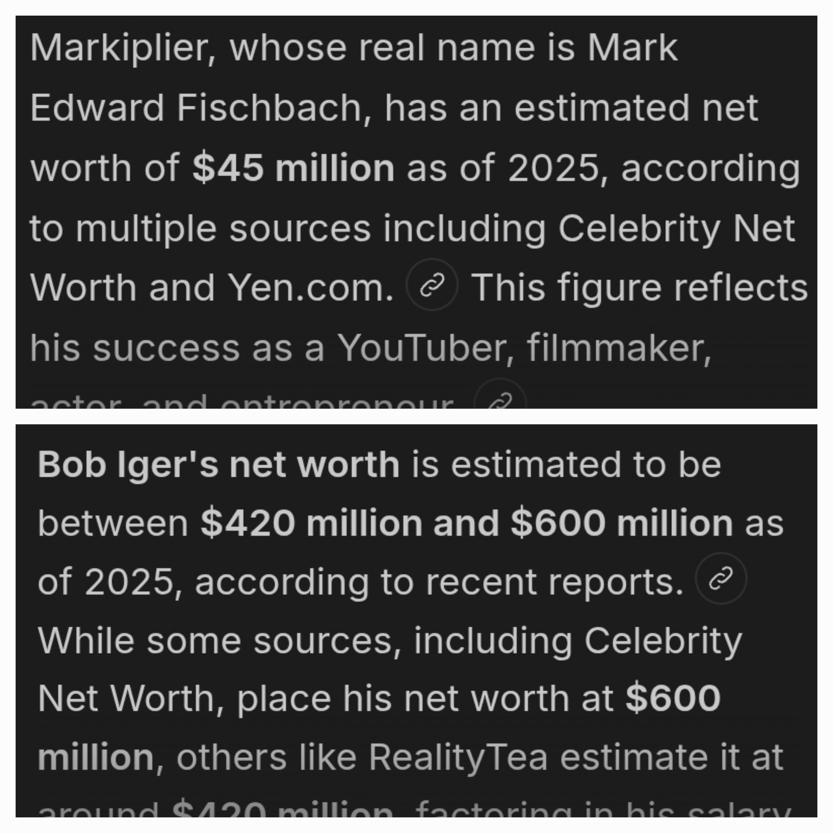 >>217793679Markiplier is not worth only 45 million dollars. People severely underestimate how much money youtubers make. They thought Cr1TiKaL made less than 10 million dollars throughout his career, turns out he made something like 50 million by his own admission. Logan Paul made over 50 million dollars in one year when he blew up. Mr Beast is a billionaire. Markiplier is one of the people who made the most money off YouTube considering his view counts and the amount of sponsor deals he's had over the years, so his numbers are at least in hundreds of millions.