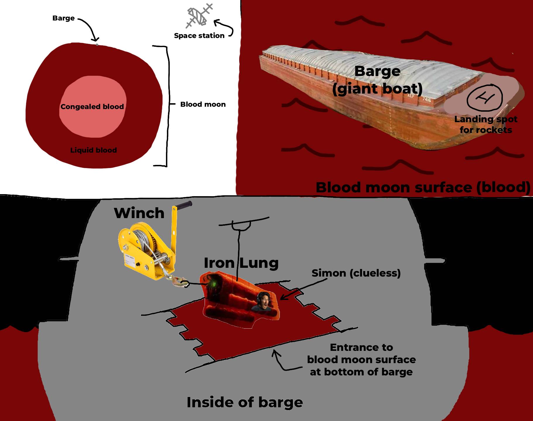 >>217793545markiplier's character, simon, mentions that it would have been more likely that the space stations, the moons and asteroids were the ones who disappeared instead, that would imply that what we're seeing in the game and in the movie are the characters experimenting being at a different dimension, where physics would work different, and that could explain how the blood oceans can stay liquid on a moon surface without atmosphere, and would suggest they're pretty much fucked for not having access to resources and for being near the domains of at least one cosmic entity 'living' in that ocean.