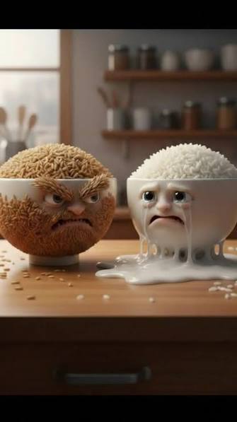 > I’m brown rice. That bowl is pure starch sugar!> I’m fluffy…> SHUP UP! Eat the whole grain!