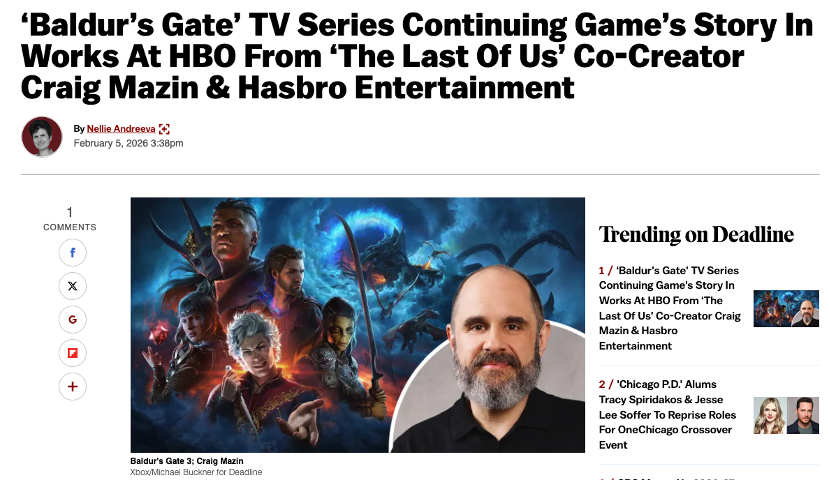 https://deadline.com/2026/02/baldurs-gate-3-tv-show-craig-mazin-hbo-1236710583/>‘Baldur’s Gate’ TV Series Continuing Game’s Story In Works At HBO From ‘The Last Of Us’ Co-Creator Craig Mazin & Hasbro Entertainment
