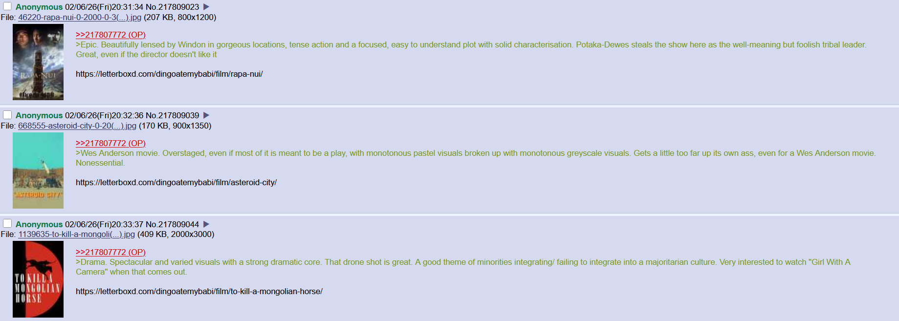 (2/2)""Best Posters" and IdentityBecause 4chan is inherently anonymous, there are no "best posters" in the traditional sense of verified influencers or usernames. However, the community is defined by specific types of anonymous contributors: The Chart Makers: These users are the unsung heroes of the general. They compile massive recommendation charts (e.g., "The Accessibility Levels" or "Essential European Noir") that circulate as the definitive guides for newcomers.The Festival Travelers: Anonymous users who attend festivals like Cannes or Berlinale and provide "boots-on-the-ground" reviews of obscure films months before they reach a wider audience.The "Gatekeepers": Though often aggressive, these posters define the thread's identity by rejecting "capeshit" (superhero films) and corporate blockbusters, forcing the discussion to stay focused on directorial intent and film history.The Archivers: Posters who link to 4plebs or Letterboxd lists that catalog every film mentioned in the general, ensuring the ephemeral discussions are preserved. The general serves as a "high-trust" environment for those looking to move beyond the IMDb Top 250 and into the deeper, more challenging corners of cinema history."