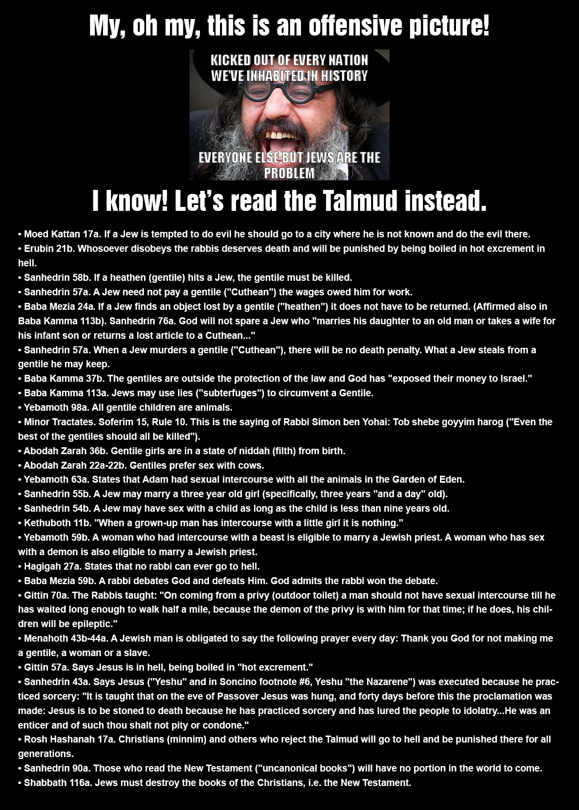 >>217808035Other shit from the Talmud: "Goyim are subhuman. Ever day before the sun rises to its highest point in the sky, goyim must pay a rabbi 1000 Shekels or an alternative arrangement of sex with the goy's wife. Blah blah blah."It doesn't exactly say that, but I'm paraphrasing.