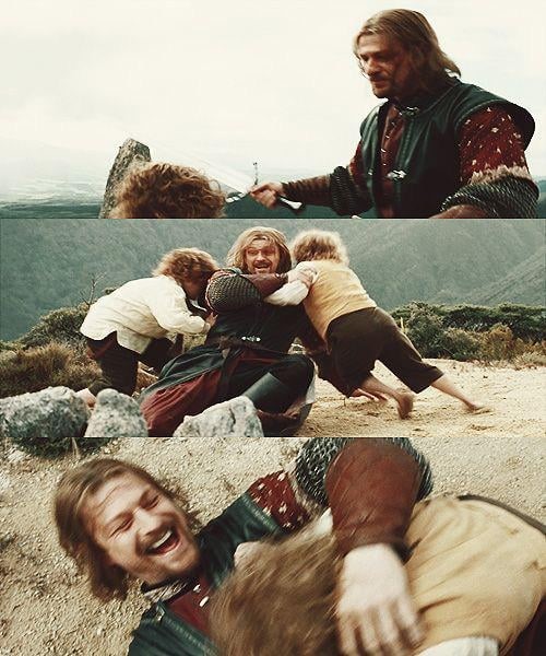 Will someone please tell Boromir that hobbits are not children? He's rolling around on the ground with grown ass adults.