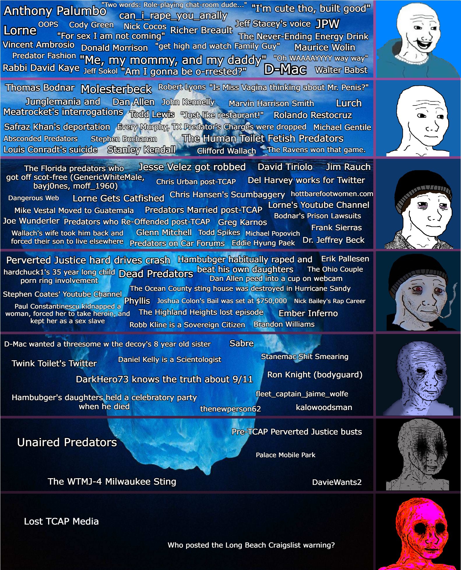 >>217822158>convicted violent rapist, rap sheet since his teenage years>came straight from prison, used public library to chat, took three buses and walked 5 hours to the sting house>started licking his lips and lunging towards the decoy before he was interruptedthere's also the cop who was driving to the sting house in the middle of the night and was stopped with a full arsenal, chainsaw, ropes, a tarp, and an anchor in his truck
