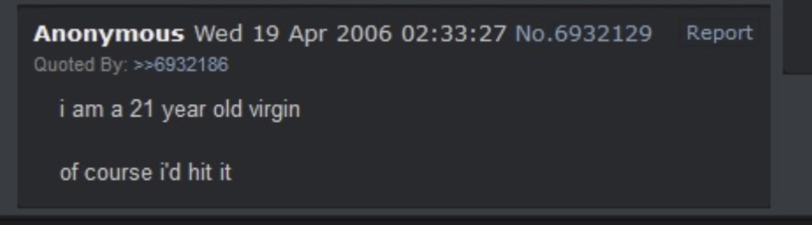 You can’t make me care anymore. Sex is for making babies. That’s why when I go outside I see parents walking around with their shithead kids. Of all the things on 4chan that has fucked with my head all this discussion about virginity is at the top.