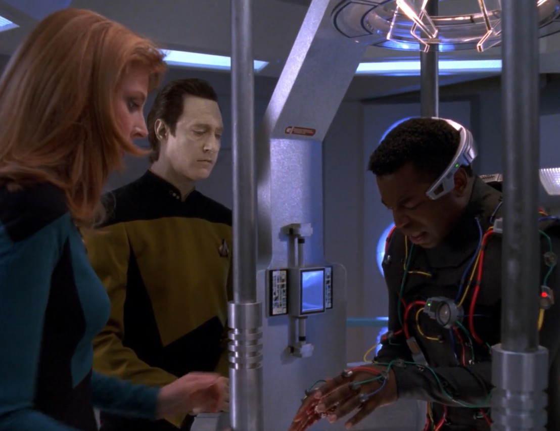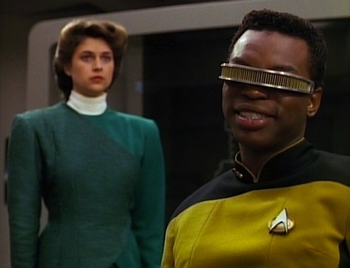 Imagine wearing a hair clip over your eyes blocking all vision and attempting to act upon the stage for 7 years and hundreds of episodes because the writers could not give you implants or some cool tech hologram that pops out and instead write an episode that makes you say thank you to the writers by having your character decide to keep it. By Grabthar's hammer, by the suns of Worvan, you shall be avenged...what a savings....