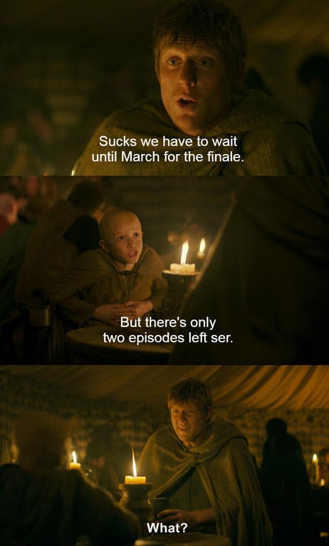 Why, yes, I too wish Dunk and Egg was more like Dance, with its shitty CGI, awful cinematography, telenovela dialogue and nonsensical plot points.Jesus fucking Christ, imagine complaining that a show isn't stretched as much as possible to the point you get seasons which are 50% filler written by a bunch Californian lesbians with daddy issues.