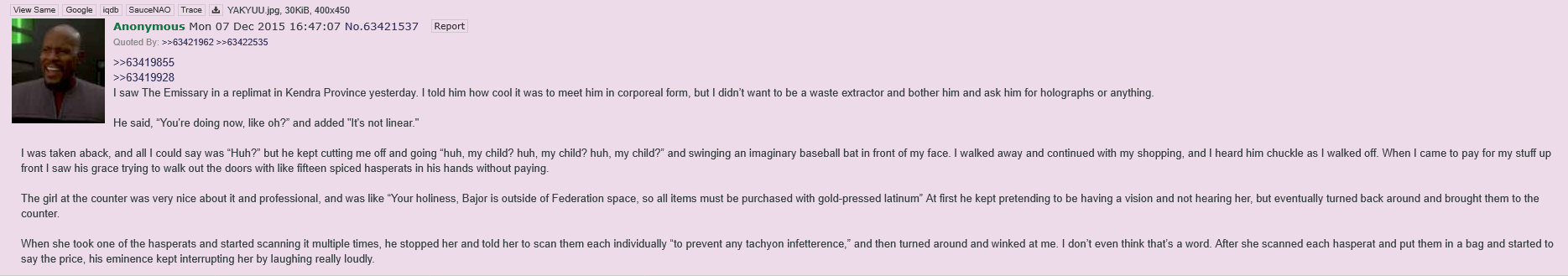 >goes undercover in civilian clothes>gets capturedTurns out having the most famous person in the entire sector, the Jesus of the Bajoran religion, try to go incognito, is really retarded