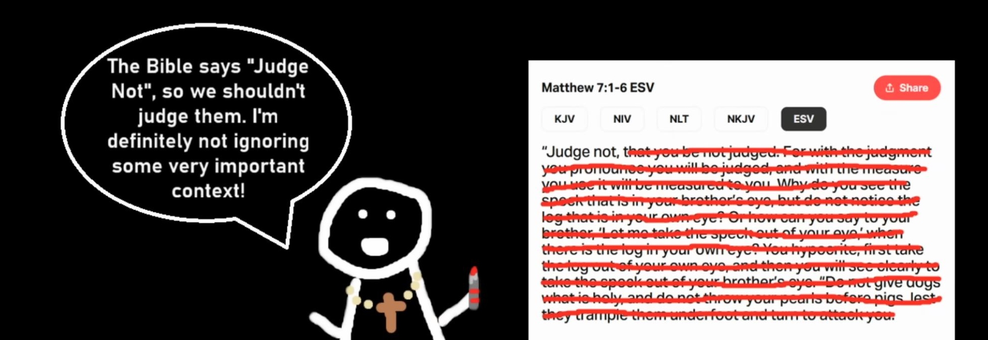 >>218015246>Do not judge, or you too will be judged. 2 For in the same way you judge others, you will be judged, and with the measure you use, it will be measured to you.>3 “Why do you look at the speck of sawdust in your brother’s eye and pay no attention to the plank in your own eye? 4 How can you say to your brother, ‘Let me take the speck out of your eye,’ when all the time there is a plank in your own eye? 5 You hypocrite, first take the plank out of your own eye, and then you will see clearly to remove the speck from your brother’s eye.>6 “Do not give dogs what is sacred; do not throw your pearls to pigs. If you do, they may trample them under their feet, and turn and tear you to pieces.The point of the verse is to not focus on being critical of the failures of others and to instead focus on your own issues instead. Judging goes both ways, so the moment you judge someone, they will judge you back. Thats the core meaning. Liberals will directly misquote all of this to mean it to say that you should just tolerate and accept anything and everything because you cant judge. The famous pearls to swine quote is basically saying dont waste your time talking to idiots.