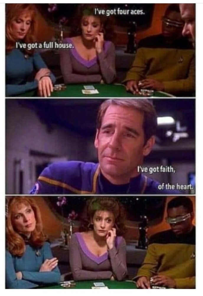 >by the way I’ve fucked 1000s of guys and love Julian and Jadzia was thinking about other guys all the time when married to you>also you’re not that great a lay WHAT did Michael Dorn do to that writer’s room?