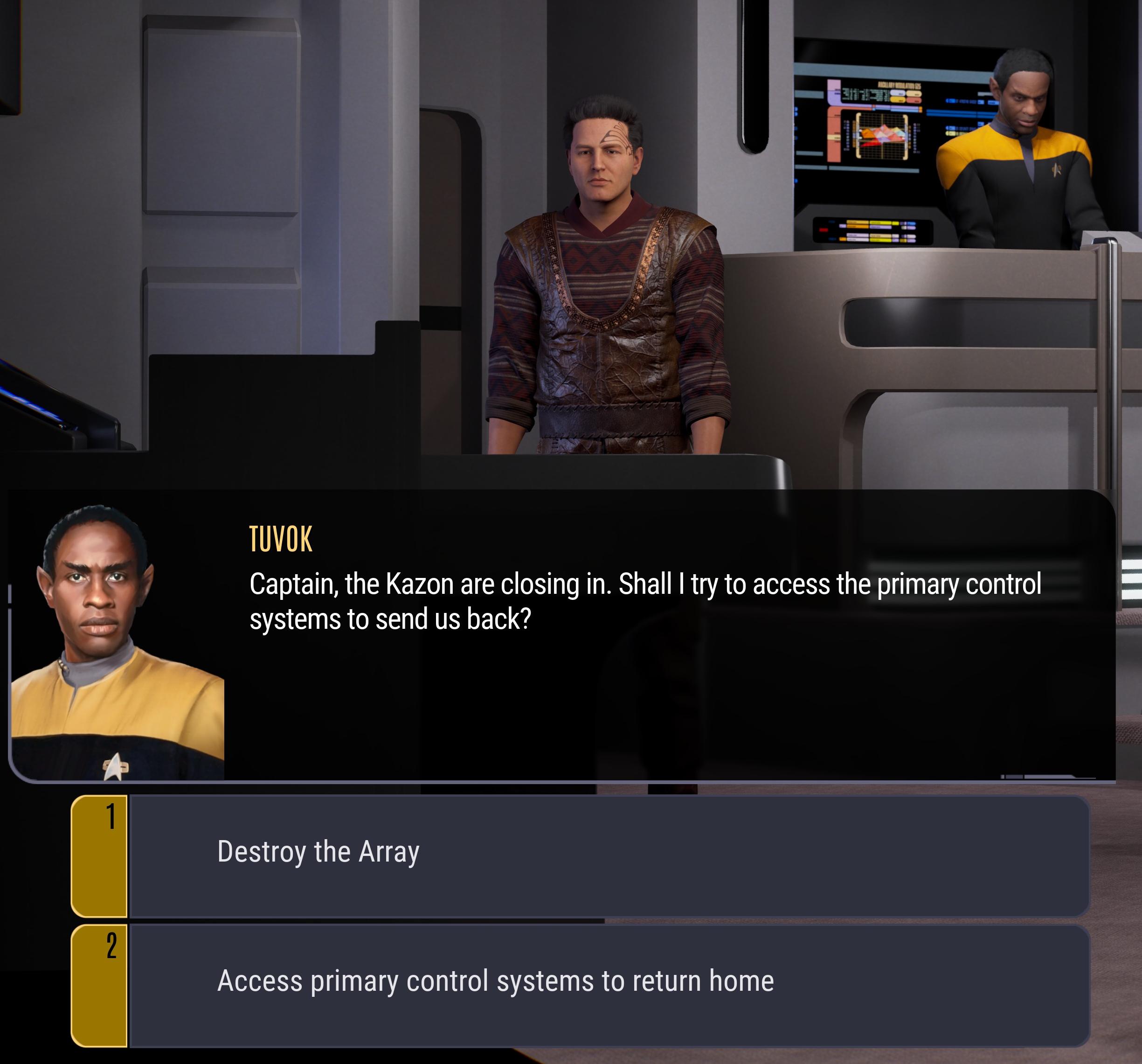 >>2180700362/2>decide to use the array>Chakotay gets pissed and bes you to reconsider>do it anyway>make it back to the alpha quadrant>can choose to arrest the Maquis (what I did) or let them go>Harry freaks out because he thinks arresting the Maquis after they helped us isn't fair>calm him down by reminding him what uniform he wears>Paris starts getting nervous>you can reassure him that the original deal for his parole hearing will go through (what I did) or stay silent>game ends